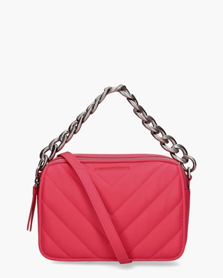 Opvallend tasje Emely Quilting uit de collectie van Les Visionnaires. Dit model is gemaakt van felroze doorgestikt leer. Het hoofdcompartiment is opgesplitst in twee delen en beide sluit je door middel van een rits. Binnenin vind je 2 steekvakjes en 4 pasjeshouders. Een extra voorvak is handig om kleine spulletjes in op te bergen. Het zilveren chainhengsel is afneembaar. Een langere verstelbare en afneembare schouderband wordt meegeleverd. is. Een subtiel merklogo voorop maakt de tas compleet. Afmetingen: hoogte: 17 cm breedte: 25 cm diepte: 8 cm. Kleur: felroze. (Hot Pink)