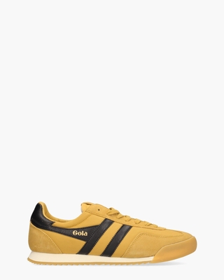 Geà nspireerd door Gola’s archief uit 1973, vindt de Europa sneaker zijn oorsprong in vintage voetbal. Het gele nylon en suède bovenwerk contrasteert met de zwarte kunstleren stripes en hielcap. De textielen voering en het uitneembare voetbed zorgen voor langdurig comfort. Op de synthetische tong prijkt een suède badge met gouden merklogo, terwijl goudkleurige branding op de zijkant en op het hielstuk een subtiele luxe toevoegen. Gestikte details, bijpassende gele veters en de oldskool witte/gummy rubberen zool met bumper maken deze throwback herensneakers compleet. Kleur: geel/zwart. (Sun/ Black)