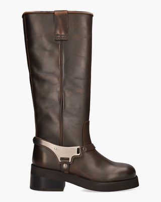 De Eve Lynn 21082700-25U laars van Nubikk geeft het klassieke bikergevoel een moderne upgrade. Gemaakt van glad, donkerbruin leer met een subtiel gevlamd effect en afgewerkt met een metalen detail aan de onderkant, stralen deze boots kracht en karakter uit. De stevige 5, 5 cm blokhak en robuuste maar lichtgewicht rubberen 2, 5 cm hoge EVA-zool zorgen voor een stabiele, comfortabele basis. Dankzij het uitneembare voetbed en de leren voering ervaar je de hele dag ondersteuning. De 37 cm hoge schacht is aan de bovenzijde voorzien van sierlussen en de omtrek van de schacht is circa 36 cm. Combineer deze laarzen met een lange wollen jas en een wijde pantalon voor een stoere winterlook met klasse. Kleur: donkerbruin. (Brown)