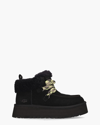 Funkarra Cabin Cuff Boot 1143954 dames veterboots van UGG. Deze halfhoge laarsjes in mocassin-style zijn gemaakt van zacht zwart suède. De binnenkant bestaat uit een mix van mesh en UGGplush-wol en beschikt over een vast voetbed. De opvallende multicolored veters voegen een uniek detail toe. Merklogo's zijn zichtbaar op de zijkant en de tong. De duurzame plateauzool, met een dikte van ongeveer 4 cm, is gemaakt van suikerriet. Extra details zoals de stiksels en de stoffen sierlus maken deze booties helemaal af. Kleur: zwart. (Black)