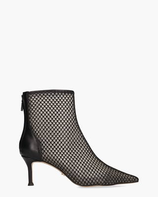 De enkelboots Gilda 173T02BK van Lola Cruz brengen verfijning en stijl in elke outfit. Deze laarsjes zijn uitgevoerd in zwart leer en bieden een luxe uitstraling. Bijzonder is de mesh overlay versierd met zwarte ministuds. De lederen en stoffen binnenkant, inclusief het vaste voetbed, zorgen voor comfort bij elke stap. Met hun spitse leest, 6, 5 cm hoge hak en een schachthoogte van ongeveer 12 cm stralen deze laarzen pure elegantie uit. Dankzij de rits aan de achterkant trek je ze moeiteloos aan en uit. Kleur: zwart. (Negro)