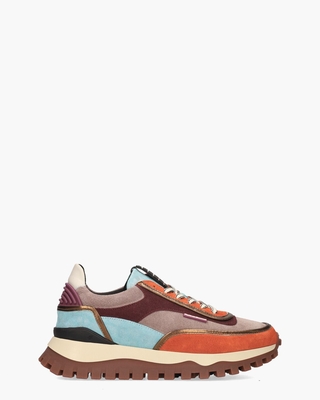 De Floris van Bommel Grommi 02.03/SFW-10131-80-01 damessneakers zijn een echte eyecatcher. Deze opvallende sneakers combineren suède in verschillende tinten zoals bordeauxrood, turquoise en oranje met bronzen metallic leren accenten. Dit maakt ze niet alleen stijlvol maar ook uniek in hun uitstraling. Rubberen inzetten op de hiel en tong met Floris van Bommel logo’s geven deze sneakers een extra dimensie van klasse en herkenbaarheid. Het draagcomfort is uitstekend dankzij de gewatteerde elementen en de stevige, driekleurige rubberen zool met grof profiel, die zorgt voor optimale grip. De sneakers zijn voorzien van een uitneembaar voetbed, wat extra gemak en flexibiliteit biedt. De tweekleurige veters, witte lederen hielcap, perforaties en zwarte stabilizer ronden de look van deze