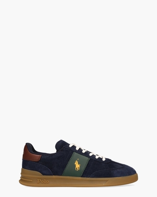 Met de Heritage Aera herensneakers van Polo Ralph Lauren voeg je een sportieve klassieker toe aan je garderobe. De bovenzijde is uitgevoerd in donkerblauw suède. De groene lederen contraststrepen opzij en de bordeauxrode leren hielcap geven de sneakers samen met de bruine rubberen cupzool een classy oldskool look. De gouden merklogo's en de geborduurde branding zorgen voor die herkenbare PRL-signatuur. Dankzij de met mesh gevoerde binnenkant, de EVA-tussenzool en het uitneembare voetbed loop je comfortabel. Witte veters en Polo-opdruk op de zool maken de classic stijl compleet. Combineer met een chino en een navy sweater voor een preppy weekendlook. Kleur: donkerblauw/multi. (Navy/Wine/Forest)