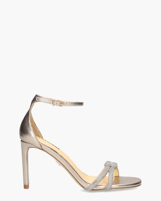 Sandalen voor dames Mamola 252Z19BK uit de collectie van het Spaanse merk Lola Cruz. Dit elegante modelletje heeft een upper van leer in een metallic gouden tint. De wreefbandjes voorzien van strass en een geknoopt design maken de sandalen super-de-luxe. De voering en het voetbed zijn ook in leer uitgevoerd. Het enkelbandje is verstelbaar. De hak is 8, 5 cm hoog en heeft een rubberen inzet. De loopzool is van leer gemaakt. Kleur: goud. (Platino)