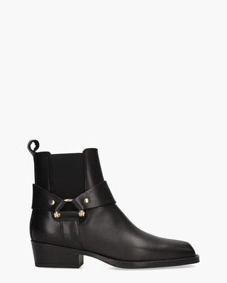 Chelseaboots op een carréleest voor dames Manzoni 5294 van het merk Alpe. Deze zwarte motorstyle booties zijn gemaakt van leer. De binnenkant is in kunststof met een vast voetbed uitgevoerd. De banden met goudkleurige decoratieve gespen en studs zorgen voor een opvallende look. Aan de zijkant hebben de laarsjes een elastische inzet en een ritssluiting. De hak is ongeveer 4, 5 cm hoog en de schacht van 14 cm is afgewerkt met een matching zwarte lederen sierlus. Kleur: zwart. (Negro)