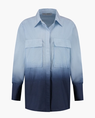 Blouse voor dames Marina Top uit de collectie van Rough Studios. Deze lange blouse is gemaakt van 100% katoen met een kleurverloop van licht- naar donkerblauw. Twee borstzakken en een klassieke blousekraag maken dit model compleet. De blouse sluit met drukkers. Kleur: blauw. (Tiedye Blue) Onderhoud: • Binnenstebuiten wassen met soortgelijke kleuren op 30 graden. • Niet in de droogtrommel drogen. • Binnenstebuiten strijken op lage temperatuur.
