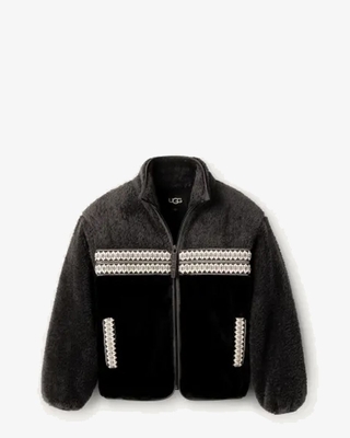 Het damesjack Marlene H Braid-Jacket 1142550 van UGG biedt een combinatie van comfort en een opvallende stijl. Dit damesjack, uitgevoerd in grijze plush fleece met zwart imitatiebont, krijgt een unieke uitstraling door de signature borduursels. De polyester voering zorgt voor extra draagcomfort, terwijl de ritssluiting met logo en de twee ritszakken praktische details toevoegen. Elastische mouwboorden maken het ontwerp compleet. Kleur: grijs/zwart. (Black Heritage Braid)