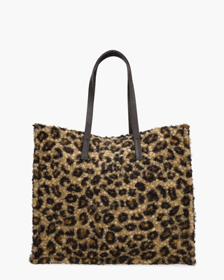 De Kassiopea Maxi tas is gemaakt om op te vallen. Het bovenwerk van zacht imitatiebont met een bruine panterprint contrasteert prachtig met de donkerbruine leren hengsels. De binnenkant is gevoerd met stof en voorzien van één ruim compartiment, afsluitbaar met een praktische drukknop. Dankzij het royale formaat van 33 x 40 x 18 cm neem je moeiteloos al je essentials mee. Kleur: bruin. (Brown) ...