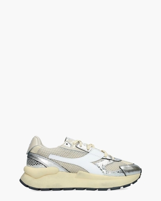 De Diadora Heritage Mercury Elite Cobra Used 201.182210-75021 damessneakers brengen een futuristische look met een vleugje retro. Het bovenwerk is uitgevoerd in ecru meshmateriaal en wit en crèmekleurig leer met metallic leren overlays met een slangenstructuur die het geheel een opvallend karakter geeft. De sneakers zijn afgewerkt met ecrukleurige veters en subtiele Diadora-logo’s op de tong en 1983 op de hiel. De voering bestaat uit leer en textiel en is voorzien van een uitneembaar voetbed dat comfort en ondersteuning biedt. De vintage-look chunky zool benadrukt het volumineuze design en de oversized stabilizer versterkt de statement uitstraling. Draag de sneakers met een cropped jeans en een oversized blouse voor een sportief-chique uitstraling. Kleur: ecru/zilver. (Ecru) ...