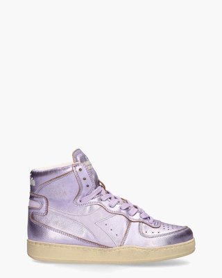 Hi-top damessneakers Mi Basket Metal Used 201.178539 uit de Heritage Collection van Diadora. Deze schoenen, geà nspireerd op de vintage 80's basketball-stijl, zijn vervaardigd van zacht en soepel paars metallic leer met een verouderde afwerking voor een authentieke uitstraling. De stoffen binnenzijde beschikt over een uitneembaar voetbed voor extra gemak. Opvallende kenmerken zoals de perforaties, lila sidestripes, en geborduurde branding op de hiel en tong, dragen bij aan de nostalgische oldskool vibe van dit paar sneakers. De schacht heeft een hoogte van ongeveer 11 cm en de rubberen zool is eveneens uitgevoerd in een vintage look. Kleur: paars. (violet Heather)