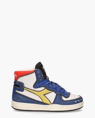 Hi-top sneakers voor heren Mi Basket Used Dessau 201.178601 uit de Heritage Collection van Diadora. Dit model, in vintage 80's basketball-stijl, is gemaakt van soepel en zacht leer met een ultra used bewerking in een opvallend dessin van wit, blauw, rood, geel en zwart. De stoffen binnenzijde is voorzien van een uitneembaar voetbed. De destroyed afwerking en de perforaties, evenals de geborduurde branding op de hiel en de tong, geven dit paar sneakers precies de juiste oldskool vibe. De schacht heeft een hoogte van ongeveer 11 cm en de witte/zwarte rubberen zool is ook in een used look uitgevoerd. Kleur: multi. (White/ Blue Cobalt)
