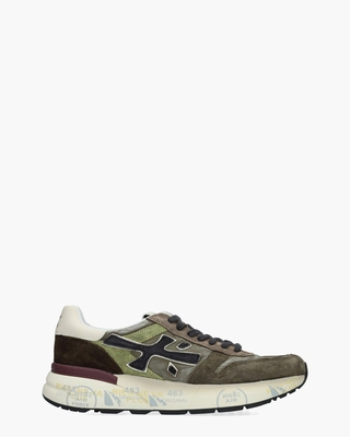 De Mick 7717 herensneaker van Premiata staat voor stijl, comfort en een krachtige uitstraling. Het bovenwerk bestaat uit groene stof met een washed finish, aangevuld met kalfssuède en leer in bruin- en groentinten. Het zwarte suède merklogo aan de zijkant geeft de schoen een krachtig accent, terwijl branding op tong en op de witte lederen hiel de exclusieve uitstraling benadrukt. Binnenin zorgen de leren en PU voering samen met het uitneembare voetbed voor optimaal draagcomfort. De robuuste rubberen zool met de kenmerkende Premiata-prints en de bordeauxrode stabilizer bieden grip en stabiliteit. Donkerbruine veters voltooien het design. Combineer deze sneakers met een straight fit chino en een lamswollen trui voor een eigentijdse look of draag ze casual met denim en een bomberjack. Kleur: groen/multi. (Green/ Multicolor)