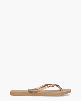 Teenslippers voor dames Slim Logo Metallic 4119875 van het merk Havaianas. Deze lichtgewicht slides zijn uitgevoerd in rubber in een roségouden unikleur met een metallic finish. De straps zijn afgewerkt met een ton-sur-ton metallic Havaianas-logo. De rubberen zool heeft een hoogte van 1 cm. Kleur: roségoud. (Rose Gold) Havaianas werkt met dubbele maten: 36 = 35/36 38 = 37/38 40 = 39/40 42 = 41/42. De Braziliaanse maatvoering (als grootst vermeld in de slipper en op de doos) wordt hierbij aangehouden.