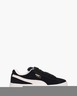 Sneakers voor dames Suede XL 395205-02 uit de collectie van PUMA. Deze retro breakdance trainer heeft een zwart suède bovenwerk met een witte leren formstrip. Aan de zijkant is een oldskool gouden merklogo zichtbaar en op de hielcap staat het golden PUMA-logo in reliëf. Nieuw is het rubberen logo op de tong en ook de gevoerde hielkraag en tong zijn groter gemaakt. De stoffen voering is voorzien van een uitneembaar voetbed. De witte iets bredere rubberen zool met branding zorgt voor grip. Zwarte katoenen veters maken de sneakers compleet. Kleur: zwart/wit. (PUMA Black/PUMA White) ...