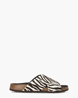 Ontdek de trendy damesslippers genaamd Teddy uit de collectie van Cypres. Deze stijlvolle slides, met kruisbanden over de wreef, zijn voorzien van een bovenkant van ponyhair met een opvallende zebraprint. De voering is vervaardigd van zacht microfiber en het voorgevormde voetbed van suède en kurk biedt extra comfort tijdens het lopen. De slipper is afgewerkt met een 2, 5 cm dikke zool met een gekartelde rubberen profielzool, wat dit zomerse model compleet maakt. Kleur: wit/zwart.
