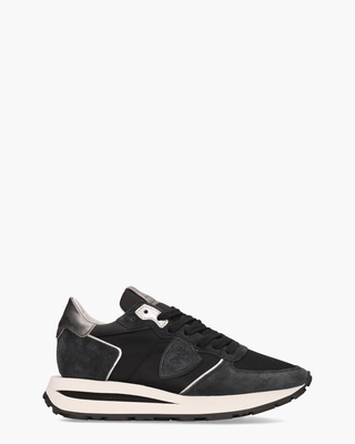Deze zwarte damessneakers Tropez Haute TKLD-W002 van het Franse sneakerlabel Philippe Model zijn gemaakt van nylon en mesh, afgewerkt met suède in een washed zwarte tint. Branding is te zien op de zilvergrijze leren hielcap en op de tong prijkt een metallic zilvergrijs lederen merkembleem. De binnenzijde is uitgevoerd in leer en comfortabel badstof, met een uitneembaar voetbed. De kenmerkende suède patch aan de zijkant maakt deze sneakers uniek. De witte/zwarte zool met een hoogte van 2 to 4 cm heeft een grof profiel voor extra grip. Zwarte katoenen veters en gelamineerde zilveren details geven de "made with care in Italy" trainers een verfijnde afwerking. Kleur: zwart. (Noir)