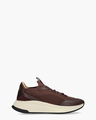 Een sneaker die stijl en comfort samenbrengt. Deze bordeauxrode herensneaker TTNM EVO van BOSS is uitgevoerd in een sokmodel met een bovenwerk van tricot. Ppanelen van leer, suède, rubber en gerecycled polyester zorgen voor diepte in het design. De EVA-zool van rubber biedt een lichte en dempende basis en het uitneembare voetbed verhoogt het draaggemak. Binnenin voelt de zachte synthetische voering prettig aan. De sneakers zijn afgewerkt met BOSS-branding op de zijkant, borduursels op de hiel, stoffen lusjes en ton-sur-ton veters. Ga voor een relaxte stijl met een chino en een sweater. Kleur: bordeauxrood. (Dark Red)