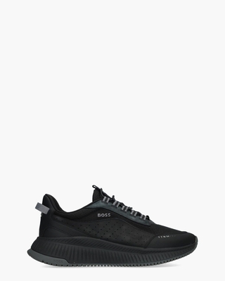Deze sneakers voor heren model TTNM EVO van BOSS zijn ontworpen voor een sportieve uitstraling met een verfijnde afwerking. Het zwarte bovenwerk bestaat uit synthetisch materiaal, suède, rubber en polyester van gerecyclede petflessen. De synthetische voering en het uitneembare Ortho Lite voetbed bieden langdurig comfort. De lichtgewicht rubberen zool in zwart zorgt voor demping en grip. Details zoals het BOSS-logo op de tong, zijkant en hielstuk, perforaties en geborduurde accenten geven de sneaker een moderne look. Lichtgrijze stoffen veterlusjes en hiellus maken de sneakers af. Draag deze sneakers met een jogging en een hoodie voor een casual streetwearstijl. Kleur: zwart. (Black)