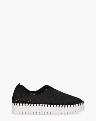 Zwarte loafers voor dames Tulip 3373 van het merk Ilse Jacobsen. Dit Deense design is handgemaakt van ademend en sneldrogend textiel (100% microvezel) met een opengewerkt patroontje. De zool van wit rubber is extreem flexibel en erg licht in gewicht waardoor hij soepel en zacht aan voelt. Het plateau heeft een hoogte van 4 centimeter en is afgewerkt met een merkreliëf op de hiel. De schoen is ongevoerd voor extra ventilatie tijdens warme zomerdagen en de stevige, uitneembare binnenzool van leer geeft veel support. Kleur: zwart. (Black)