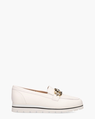 Damesloafers Tyess uit de collectie van Di Lauro. Deze instappers hebben een wit lederen upper en zijn gevoerd met leer. Het goudkleurige schakeldetail op de wreef geeft dit model een uniek tintje. Op de witte rubberen wedgezool van ongeveer 3 cm hoogte, met een contrasterende zwarte streep, loop je comfortabel. Aan de zijkant van de wreef zorgt de elastische bewerking voor een perfecte pasvorm. Bovendien zijn de sneakerloafers voorzien van een uitneembaar voetbed voor extra gemak. Kleur: wit. (White)