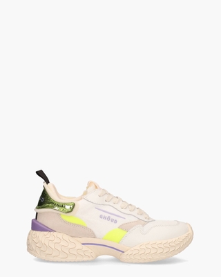 Sneakers voor dames Tyre Low uit de collectie van Ghoud. Dit sportieve modelletje op een chunky zool heeft een upper van mesh, suède en lakleer in wit, off-white, beige, neongeel en groen. De binnenzijde is in stof uitgevoerd en heeft een uitneembaar voetbed. Op de tong, het hielstuk en opzij zijn Ghoud-logo's zichtbaar. De off-white blown-up rubberen zool is 4 cm dik en is voorzien van een patroontje. Lila accenten, zoals de kunststof stabilizer, gebroken witte veters en een zwarte stoffen hiellus maken de stylish shoes af. Kleur: wit/multi. (White/Violet)