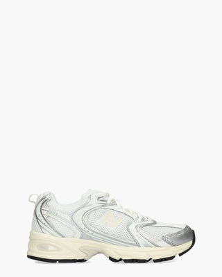 Deze New Balance U530ESB damessneakers zijn een frisse interpretatie van een 2000's retrofavoriet. Het design bestaat uit luchtig wit mesh en metallic panelen in zilver, afgewerkt met witte en gebroken witte kunstlederen accenten. Het iconische 'N'-logo en de 530 stijlnaam op de zijkant geven de sneaker een authentieke NB uitstraling. Binnenin is de schoen voorzien van een stoffen voering en een uitneembaar voetbed dat comfort en ondersteuning garandeert. De robuuste rubberen buitenzool met ABZORB-technologie maakt dit model perfect voor dagelijks gebruik. Witte veters en subtiele perforaties maken de sporty stijl af. Draag dit model met een straight fit pantalon en een losvallende blouse voor een cityproof look of kies voor een cycling short en een oversized sweater voor een sportief statement. Kleur: wit/zilver. (Silver Metallic/ Linen) ...