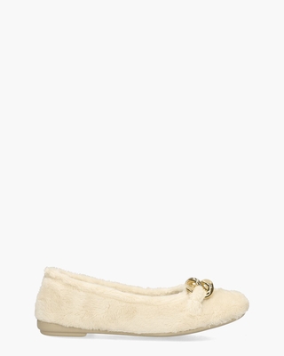 Met deze Cypres damespantoffels Varoya kies je voor comfort en elegantie. Dit ballerinamodel, gemaakt van zacht fake fur in een roomwitte tint, voelt heerlijk warm en knus aan. De volledige voering van hetzelfde fluffy materiaal zorgt voor extra zachtheid. Het gouden kettingdetail op de wreef voegt een vleugje luxe toe aan deze schattige pantoffels. Met een rubberen zool en een subtiel hakje van 1 cm, bieden ze niet alleen grip maar ook duurzaamheid, waardoor je er moeiteloos zowel binnen als buiten stijlvol mee loopt. Kleur: roomwit. (Cream)