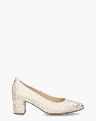 Pumps voor dames 41.450.32 uit de collectie van het merk Gabor. Dit elegante model heeft een bovenzijde van leer in een wit en gouden metallic animalpatroontje. De binnenkant is volledig in zacht leer uitgevoerd en heeft een vast voetbed. Het neusje is iets puntig. Op de rubberen zool en de blokhak met een hoogte van 5, 5 cm loop je comfortabel. De pumps zijn tot slot op een normale F-leest gemaakt en hebben voor extra comfort een zacht gevoerde zool van schuimstof en zijn extra gevoerd bij de hiel en bal van de voet voor een dubbelzacht loopgevoel. Kleur: wit/goud. ...