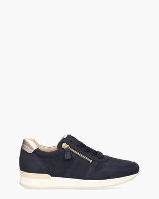 Sneakers voor dames 23.420.16 van het merk Gabor. Deze schoen is gemaakt van donkerblauw nubuck met goudkleurige leren accenten. De binnenkant met uitneembaar voetbed is in suède en leer uitgevoerd. De goudkleurige ritsjes zorgen ervoor dat je de schoenen makkelijk aan- en uittrekt. De witte/lichtbeige rubberen zool heeft een subtiel kartelprofiel zodat je goede grip hebt. Ook hebben de F-leest schoenen een iets verbreed loopvlak zodat je lang op deze comfortabele sneaks uit de Best Fitting-lijn kunt lopen. Donkerblauwe veters en een beige rubberen stabilizer maken de schoenen af. Kleur: donkerblauw.