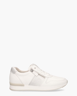 Witte leren sneakers 42.420.20 van Gabor. De binnenkant, inclusief een handig uitneembaar voetbed, is superzacht met suède en leer. Opzij en bij de hielcap geven zilveren details de sneakers een bijzondere touch. Met de handige zilveren ritsjes trek je ze ook nog eens makkelijk aan en uit. De witte/beige rubberen zool heeft een subtiel kartelprofiel, dus je hebt lekker goede grip. En weet je wat zo fijn is? Deze schoenen hebben een F-leest en een iets breder loopvlak, zodat je er de hele dag comfortabel op kunt rondstappen. En de afwerking met de witte veters, het zilverkleurige merkembleem op de tong en de beige rubberen stabilizer maken dit model helemaal af. Kleur: wit/zilver.