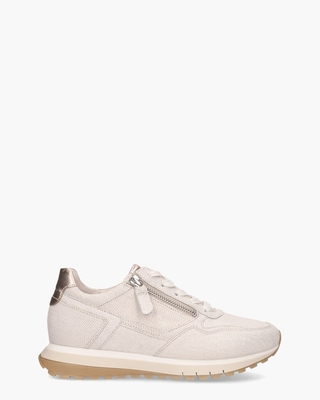 Sneakers voor dames 46.378.80 van het merk Gabor. Deze schoen is gemaakt van beige leer met een all-over print en een glinsterende afwerking. Op de hielcap en de tong geeft metallic goud leer de sneakers een luxe look. De binnenkant met uitneembaar voetbed is in suède en leer uitgevoerd. Het ritsje opzij zorgt ervoor dat je de schoenen makkelijk aan- en uittrekt. De driekleurige rubberen zool heeft een grof kartelprofiel zodat je goede grip hebt. Ook hebben de H-leest schoenen een iets verbreed loopvlak zodat je lang op deze comfortabele sneaks kunt lopen. Gebroken witte veters maken de schoenen af. Kleur: beige.
