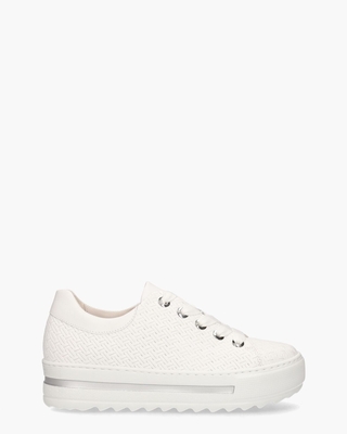 Ontdek de damessneakers met het modelnummer 46.496.20 uit de Comfort-lijn van het gerenommeerde merk Gabor. Deze schoenen hebben een upper van wit leer met een stijlvol gevlochten design. Het interieur, compleet met een Optifit uitneembaar voetbed, is eveneens vervaardigd van leer voor een luxueuze feel. De opvallende witte rubberen plateauzool, met een zilveren streep, heeft een hoogte van 4, 5 cm, wat zorgt voor een trendy uitstraling en extra comfort. Deze sneakers zijn vervaardigd in een medium G-wijdte om een optimale pasvorm te garanderen. Zilveren veteroogjes en witte katoenen veters voegen een subtiele, maar elegante touch toe aan dit model. Kleur: wit. (White)