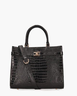 De Carol J. by Gianni Notaro 466 handtas is een stijlvolle tas van zwart glanzend leer met een crocoprint. Het klassieke design krijgt een elegante uitstraling door de decoratieve gesp met slotje waarmee je de tas veilig kunt afsluiten. De binnenkant, volledig uitgevoerd in leer, heeft een ruim compartiment met zowel een steekvak als een ritsvakje voor kleinere items. Goudkleurige details, zoals het schakelmateriaal en de noppen aan de onderkant, geven de tas een luxe afwerking. De verstelbare leren extra bijgevoegde schouderband zorgt voor meer draagopties. Afmetingen: hoogte 28 cm, breedte 34 cm, diepte 12 cm. Kleur: zwart. (Nero)