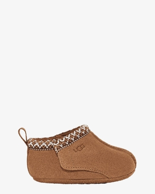 De UGG Baby's Tasman Boot 1130359I is gemaakt van luxueus suède met een kindvriendelijke klittenbandsluiting en gevoerd met behaaglijke UGGplush voor de zachtheid die je van UGG gewend bent, terwijl een rubberen zool met goede grip helpt bij de eerste stapjes. Het UGG-logo in reliëf, het soffen hiellusje en de borduursels bij het kraagje maken de mini-schoentjes compleet. Kleur: cognac. (Chestnut) (XS = maat 16 / 0 - 6 maanden) (S = maat 18 / 6 - 12 maanden)