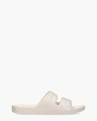 Deze damesslippers genaamd Basic van het merk Freedom Moses zijn perfect voor de zomer. Ze hebben een off-white glittery bovenzijde en zijn waterbestendig en gemakkelijk schoon te maken. De slippers zijn vervaardigd van milieuvriendelijk plastic en beschikken over een comfortabele voorgevormde zool. De "gespjes" op de twee wreefbanden met merklogo aan de zijkant voegen een speels accent toe aan de slippers. Kleur: off-white. (Moon) Freedom Moses werkt met dubbele maten: 37 = 37/38 38 = 38/39 39 = 39/40 40 = 40/41 41 = 41/42. De maatvoering, als eerste vermeld in de slipper, wordt hierbij aangehouden.