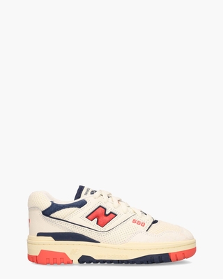 De New Balance '89 retro basketbalschoen, model BB550CPB, brengt een tijdloze stijl samen met moderne technologie. Deze sneakers hebben een bovenwerk van leer, synthetisch materiaal, suède en mesh, uitgevoerd in off-white, donkerblauw en rood. Het iconische 'N'-logo prijkt op de zijkanten, met extra branding op de tong, hiel en zool. De comfortabele stoffen binnenzijde en het uitneembare OrthoLite-voetbed zorgen voor optimale demping. De driekleurige, slijtvaste rubberen buitenzool biedt zowel comfort als duurzaamheid. Perforaties en roomwitte katoenen veters ronden deze damesschoenen perfect af. Kleur: multi. (Sea Salt/Blast Red)