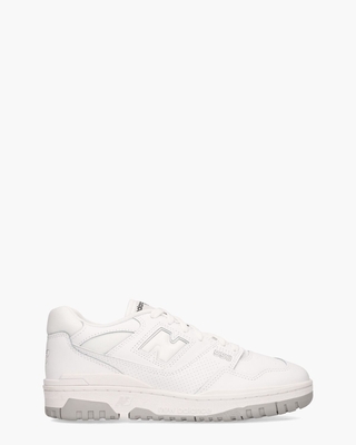 De New Balance '89 retro basketbalschoen, model BB550PB1, combineert een klassiek ontwerp met moderne materialen. Het witte bovenwerk bestaat uit een mix van leer, synthetisch materiaal en mesh. Het iconische 'N'-logo siert de zijkanten van de sneaker, terwijl de branding ook te vinden is op de tong, het hielstuk en de zool. De binnenzijde is gemaakt van comfortabele stof en voorzien van een uitneembaar Ortho Lite-voetbed voor extra demping. De witte/grijze, slijtvaste rubberen buitenzool biedt ultiem comfort en duurzaamheid. Perforaties en witte katoenen veters maken deze damesschoenen compleet. Kleur: wit. (White)