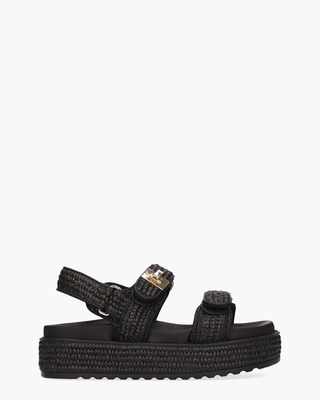 De Bigmona Sandal SM11003034-02002-00S damessandalen van Steve Madden combineren een toffe zomerse look met comfortabel design. Het bovenwerk van zwarte synthetische raffia geeft deze platformsandalen een stijlvolle uitstraling.  De verstelbare klittenbandsluitingen over de wreef zorgen voor een goede pasvorm. De binnenkant en het zachte, voorgevormde voetbed zijn uitgevoerd in kunststof voor extra draagcomfort. De 3 cm hoge platformzool, eveneens bekleed met raffia, wordt ondersteund door een rubberen gekartelde onderzool voor grip en stabiliteit. Goudkleurige hardware voegt een verfijnde finishing touch toe.  Kleur: zwart. (Black)