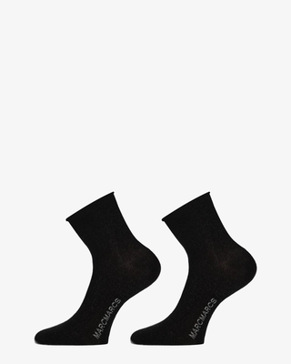 Een vleugje glitter, volop comfort. De Marcmarcs damessokken Blackpool 2-Pack combineren stijl en zachtheid in één. De viscoseblend met lurex zorgt voor een verfijnde glans, terwijl de elastische structuur prettig aansluit. Ideaal voor een feestelijke outfit of gewoon als stijlvolle finishing touch. Samenstelling: 70% viscose, 18% polyamide, 10% lurex, 2% elastaan. Kleur: zwart. (Black) (S = 35-38) (M = 39-42) Onderhoud: • Binnenstebuiten wassen met soortgelijke kleuren op 30 graden. • Niet in de droogtrommel drogen. • Niet strijken.
