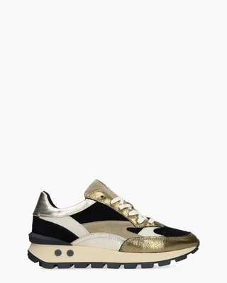 De Floris Van Bommel Blokki 04.00/SFW-10098-91-01 damessneakers brengen verschillende tinten samen zoals zwart, beige en off-white in een mix van suède en leer afgewerkt met metallic leer in verschillende goudtinten. De gewatteerde details en de stevige gebroken witte/zwarte Blokki-zool geven een comfortabel draaggevoel. Dankzij het uitneembare voetbed geniet je van extra gebruiksgemak. Gouden merkdetails sieren de tong en het hielstuk en ook de zwarte stabilizer is voorzien van logo’s. Zwarte rubberen logonopjes en off-white veters maken het ontwerp compleet. De sneakers zijn uitgevoerd in een normale G-leest. Ga voor een casual look met een lichtblauwe jeans, zwarte blazer en een metallic crossbodytas. Kleur: zwart/goud/multi. (Gold) Floris Van Bommel schoenen vallen doorgaans iets ruimer uit.