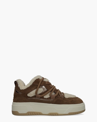 Chunky en cozy: de Boomer-F SM11003865-03006-839 damessneaker van Steve Madden heeft een bovenwerk van donkerbruin suède en metallic leer met warme wollen accenten in een gebroken witte tint. Binnenin zorgt de mix van wol en stof voor een zachte pasvorm, terwijl het vaste voetbed stabiliteit biedt. De robuuste rubberen platformzool van 4 cm geeft grip en benadrukt de chunky look. Opvallende veters in 2 stijlen, oversized stoffen lussen en een rubberen merklogo op de hiel ronden het ontwerp af. Draag ze met een wide leg jeans en oversized hoodie voor een urban streetstyle of ga voor een casual weekendlook met een joggingbroek en puffer jacket. Kleur: donkerbruin. (Chestnut/ Multi)