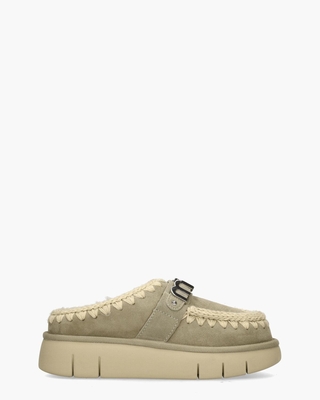 Slippers voor dames Bounce Clog Metal Logo uit de collectie van MOU. Deze slides hebben een upper van zacht suède in een groene tint. De binnenkant is in lekkere warme schapenwol met een vast voetbed uitgevoerd. De opvallende handgestikte bewerking is kenmerkend voor het merk MOU. De band op de wreef is voorzien van een zilverkleurig MOU-logo. Op de beige rubberen EVA-zool met een hoogte van ongeveer 4, 5 cm loop je comfortabel. Kleur: groen. (Laurel Oak) ...