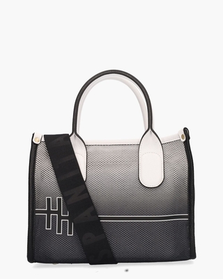 Deze mini-shopper BV253825 uit de collectie van Hispanitas is een absolute eyecatcher, vervaardigd van imitatieleer en meshmateriaal met een kleurverloop van zwart naar wit. Op de voorkant prijkt het Hispanitas-logo. Binnenin beschikt dit model over een groot compartiment met een lila afneembare pouch met rits. Een afneembare en verstelbare logo-schouderriem wordt meegeleverd. De metalen hardware geeft de tas een perfecte finishing touch. Bovendien heeft de tas beschermnopjes zodat je jouw bag mooi houdt. Afmetingen: 19 cm hoog, 25 cm breed en 10 cm diep. Kleur: zwart/wit.   (Black/ White)