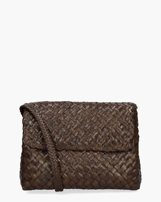 Deze crossbody bag Caroline Dama van het Belgische tassenmerk Allan K is met zorg met de hand gevlochten uit donkerbruin leer. De tas heeft een 52 cm lange, fijngevlochten schouderband en sluit met twee onzichtbare magneten onder de flap. Binnenin vind je een katoenen voering met meerdere vakken, waaronder een ritsvak voor kleinere essentials. Afmetingen: hoogte 14 cm, breedte 23 cm, diepte 10 cm. Kleur: donkerbruin. (Brown)