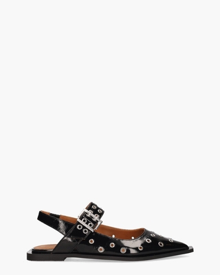 Deze Toral Casandra sandalen in ballerinastijl hebben een zwart lakleren upper. Opvallend is de versiering met zilveren studs. De band over de wreef is verstelbaar door middel van de zilverkleurige gesp. De binnenkant is in leer uitgevoerd. Het elastische gedeelte in de hielband zorgt voor een fijne pasvorm. De puntige leest is afgewerkt met een carré in de rubberen zool. Een 1 cm hoog hakje maakt de toffe shoes af. Style deze sandaaltjes met een jeans, shirt en blazer. Kleur: zwart. (Negro) Gebruik voor laklederen schoenen of tassen altijd een Lack Polish (https://www.vanarendonk.nl/collonil-lack-polish/) of Lack Mousse (https://www.vanarendonk.nl/collonil-lack-mousse/) om het leer soepel te houden en zet lakschoenen in schoenspanners (https://www.vanarendonk.nl/nico-5212-ceder-spanner-flex-universal/) zodat er geen vuil in het lakleer kan dringen.