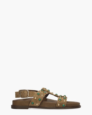 Deze damessandaal van Inuovo model D51009 trekt direct de aandacht. Het bruine suède vormt een stoer contrast met de goudkleurige studs en groene sierstenen. De kruislings geplaatste banden geven de sandaal een speelse touch, terwijl de verstelbare gesp zorgt voor een goede pasvorm. Het voorgevormde leren voetbed voelt zacht aan en biedt extra ondersteuning. De platte zool houdt het silhouet strak en stijlvol. Kleur: bruin. (Sigaro) ...