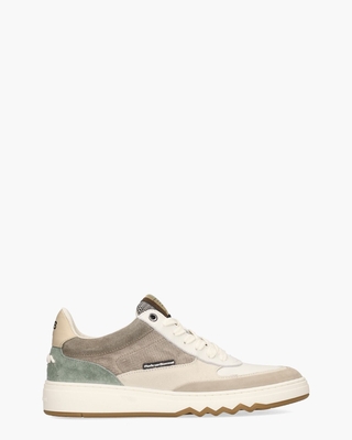 Deze herensneakers van Floris van Bommel, genaamd De Kupster 05.14/SFM-10143-22-01, zijn vervaardigd van hoogwaardig kalfsleer en deels geperforeerd suède in verschillende tinten zoals wit, beige, off-white, taupe en lichtgroen. De sneaker is voorzien van een lichtgewicht cupzool met een opvallend gummy zigzag-patroon aan de zijkant, wat zorgt voor een uniek en dynamisch element. De voering van de schoen is gemaakt van leer en het voetbed is uitneembaar, waardoor het gemakkelijk is aan te passen aan individuele behoeften en voorkeuren. Branding vind je op de zwarte/grijze mesh tong, op de hielcap en aan de acherkant van de zool. Witte katoenen veters en een wit rubberen zig-zagje achterop maken de comfortabele sneakers compleet. Kleur: multi. (Light Brown) Schoenen van Floris Van Bommel hebben over het algemeen een iets ruimere pasvorm.