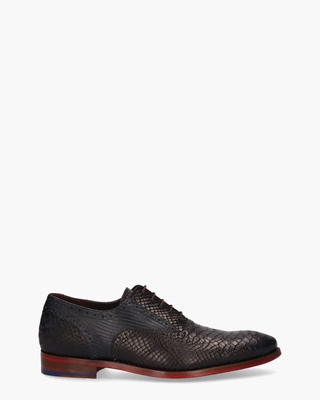 Molières voor heren De Stapper 05.17/SFM-30238-41-03 uit de collectie van Floris Van Bommel. Gemaakt van kalfsleer in twee tinten blauw en met verschillende printjes val je met deze classic veterschoenen ècht op. De broguebewerking geeft de derby extra elegantie en de rode zool en het kobaltblauwe detail in de hak zorgen voor een sportieve touch. Donkerbruine ronde veters van gewaxt katoen maken de schoenen compleet. Het binnenwerk is ook in leer uitgevoerd en de schoenen zijn vervaardigd in een normale G½-leest. Kleur: donkerblauw. (Dark Blue) Maak jouw outfit helemaal compleet met de bijpassende FVB riem De Belter 10.12 (). Schoenen van het merk Floris Van Bommel vallen over het algemeen iets ruimer uit.