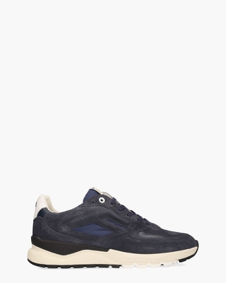 Herensneakers model De Treener 01.12/SFM-10154-41-01 van Floris Van Bommel. De bovenkant bestaat uit suède en synthetische stof in een klassieke donkerblauwe tint. De leren voering en het uitneembare voetbed zorgen voor een fijne pasvorm. De off-white/zwarte rubberen zool met kobaltblauw en wit kartelprofiel biedt stabiliteit en loopcomfort. Kenmerkende details, zoals de suède F op de zijkant, het stoffen merkembleem op de tong en zwarte geborduurde branding op de witte leren hielcap, geven de sneaker de welbekende signature FVB-look. Donkerblauwe veters, een zwarte rubberen stabilizer, donkerblauwe rubberen siernopjes en witte metalen eyelets maken de sneakers af. Dit model is tot slot gemaakt op een normale G½-leest. Kleur: donkerblauw. (Dark Blue) Schoenen van het merk Floris