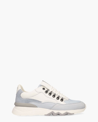 Deze handgemaakte Floris Van Bommel De Zager 01.24/SFM-10135-42-02 sneakers voor heren combineren ambacht en stijl. Het ontwerp speelt met contrasten in materialen zoals leer, suède en mesh in de kleuren wit en lichtblauw. Binnenin bieden een leren voering en een uitneembaar voetbed ultiem draagcomfort. De witte rubberen runningzool met lichtgrijs kartelprofiel zorgt voor grip en een sportieve uitstraling, terwijl details zoals het rubberen merkembleem op de tong, een rubberen logo aan de zijkant en FVB-branding op de hiel de herkenbare Floris-touch toevoegen. Ronde witte veters en metalen veteroogjes, samen met een lichtgrijze kunststof stabilizer met logo, maken het ontwerp helemaal af. Dit model heeft een normale G½-leest. Kleur: wit/lichtblauw. (White/ Light Blue) Floris Van Bommel schoenen vallen over het algemeen iets ruimer uit.